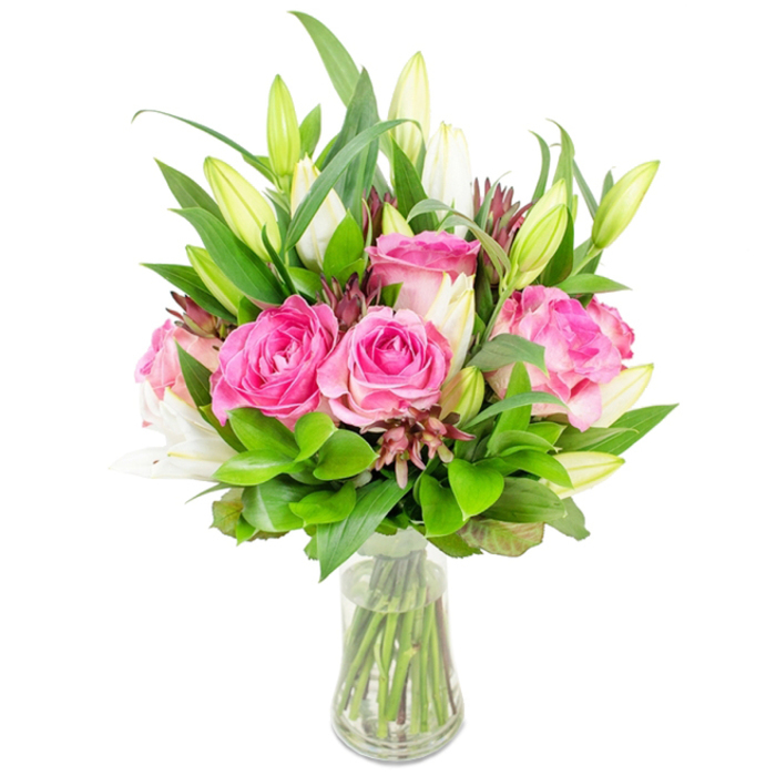 Enhance any setting with our elegant bouquet, showcasing the exquisite combination of white lilies and pink roses. This distinctive arrangement is perfect for conveying love and admiration.