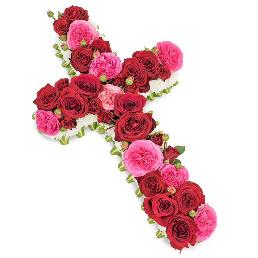 Express your heartfelt emotions with our beautiful cross-shaped bouquet. This stunning arrangement features a harmonious mix of white chrysanthemums, red roses, and pink garden roses, artistically arranged to create a meaningful and elegant display.