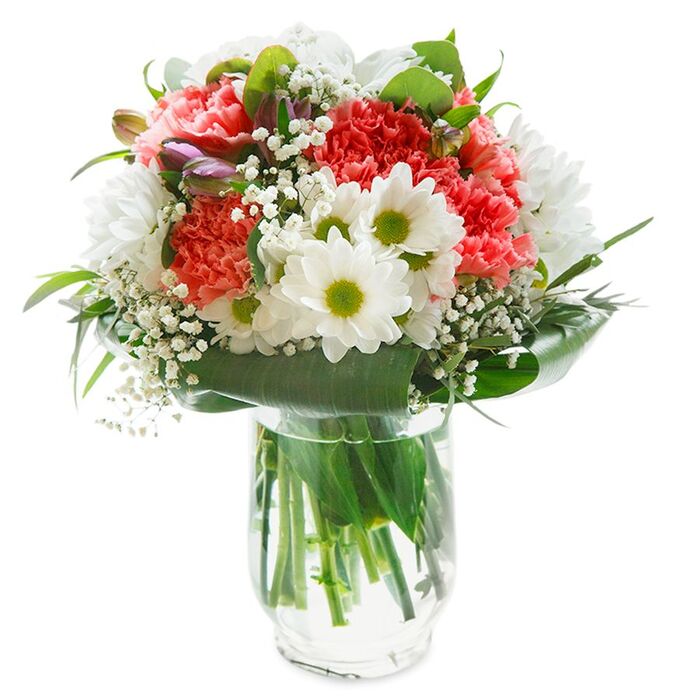 All the spirit of a joyful spring afternoon in Primrose Hill is gathered into this stunning bouquet, upright in an elegant square white gift bag. Soft coral and peach carnations with lavish, frilly petals mingle with dazzling white daisies, each crowned by a sunny yellow-green center that brightens the arrangement like sunrise over Regent's Park. Sprigs of pure white baby's breath float airily among the flowers, echoing the gentle breezes that stir the trees on Albert Terrace. Hints of purple emerge from tender, unopened buds on the left, drawing the eye and adding intrigue, much like the surprises tucked away in the area's winding streets. A rich border of glossy, deep green foliage embraces the flowers, shaping the arrangement into a generous, rounded form that bursts with freshness and care. The sturdy gift bag-accented with white ribbon handles-makes it ready to grace any doorstep, whether for a birthday celebration overlooking Chalcot Square or an unexpected expression of affection on King Henry's Road. Every element is composed with artistic precision and heartfelt intention, reflecting the artistry and dedication of Primrose Hill's finest florists. This presentation promises not only striking visual beauty but also the tender joy of a thoughtful gift delivered locally and with love. 1502195140_l_99-900x900.jpg Radiating joyful freshness and effortless elegance, this bouquet mirrors the welcoming, creative vibe of Primrose Hill. A lively cluster of coral-pink carnations occupies the centre, each flower ruffled and vivid, conveying both exuberance and a sense of comfort not unlike a stroll through Primrose Hill Market on a sunny day. Encircling them, white chrysanthemums and daisies with bright green-yellow hearts open wide, bringing a touch of innocence and youthful optimism to the design. Wisps of feathery baby's breath weave between the more substantial blooms, their tiny blossoms softening the arrangement and imbuing it with a sense of airy movement, as though caught in a gentle local breeze. At the bouquet's edge, the promise of magenta alstroemeria buds hints at unfolding surprises to come, adding intrigue among the harmonious palette. Deep green, glossy leaves cradle the flowers from below, while slender foliage threads upward, linking each bloom into a unified whole. Everything is displayed in a pristine glass vase, where cool water magnifies the strength and vitality of the stems beneath the surface. Bathed in bright, consistent light, the bouquet glows on a flawless white background, focusing every detail for maximum impact. This carefully arranged floral piece, reminiscent of treasured moments in nearby parks and streets, is ideal as a cheerful birthday gift, a thank-you gesture, or a meaningful centrepiece, poised to bring positivity and a breath of Primrose Hill into any environment.